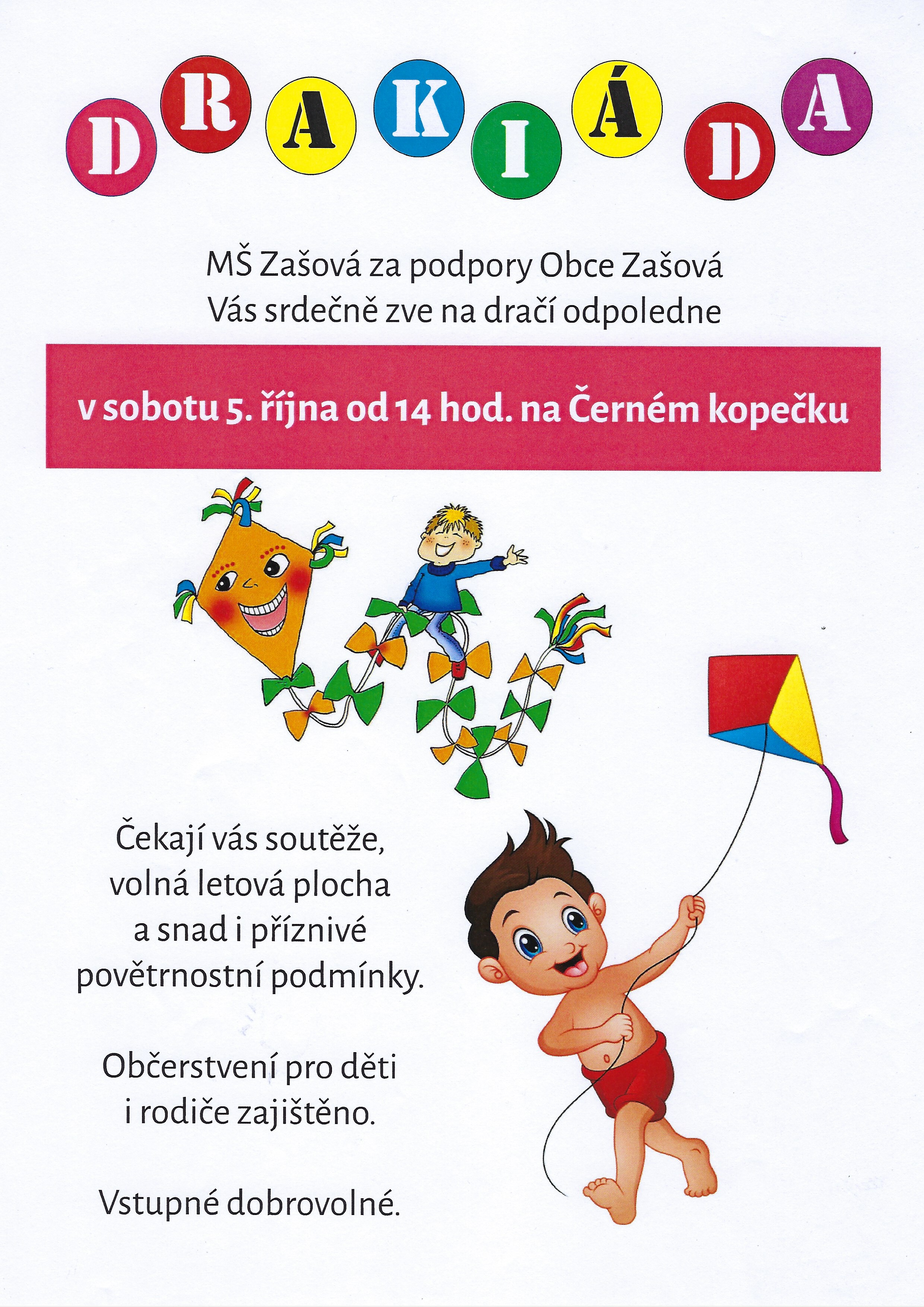 MŠ Zašová za podpory Obce Zašová zve všechny děti a rodiče na dračí odpoledne v sobotu 5. října od 14 hod. na Černém kopečku. Čekají vás soutěžě, volná letová plocha a snad i příznivé povětrnostní podmínky. Občerstvení pro děti i rodiče. Vstupné dobrovolné.